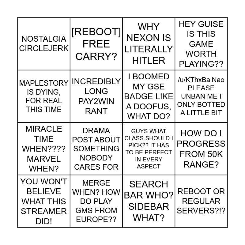 This bingo card has a free space and 15 words: YOU WON'T BELIEVE WHAT THIS STREAMER DID!, REBOOT OR REGULAR SERVERS?!?, WHY NEXON IS LITERALLY HITLER, NOSTALGIA CIRCLEJERK, /u/KThxBaiNao PLEASE UNBAN ME I ONLY BOTTED A LITTLE BIT, MAPLESTORY IS DYING, FOR REAL THIS TIME, DRAMA POST ABOUT SOMETHING NOBODY CARES FOR, SEARCH BAR WHO? SIDEBAR WHAT?, INCREDIBLY LONG PAY2WIN RANT, MIRACLE TIME WHEN???? MARVEL WHEN?, HOW DO I PROGRESS FROM 50K RANGE?, HEY GUISE IS THIS GAME WORTH PLAYING??, I BOOMED MY GSE BADGE LIKE A DOOFUS, WHAT DO?, [REBOOT] FREE CARRY? and MERGE WHEN? HOW DO PLAY GMS FROM EUROPE??.