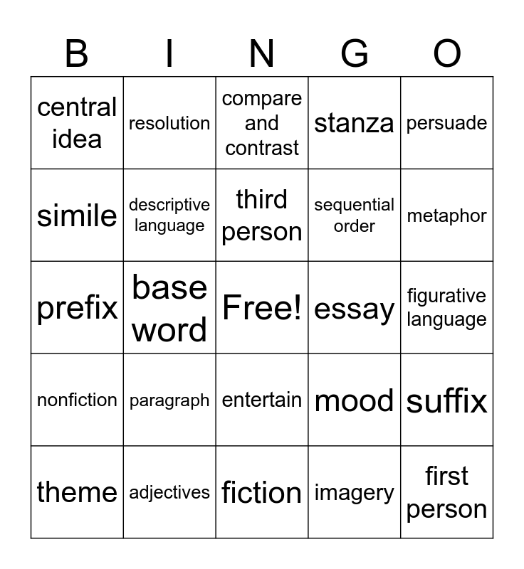 This bingo card has a free space and 30 words: adjectives, alliteration, base word, cause and effect, central idea, compare and contrast, descriptive language, entertain, essay, fiction, figurative language, first person, imagery, inform, metaphor, monitoring comprehension, mood, nonfiction, paragraph, persuade, prefix, conflict, resolution, sequential order, simile, stanza, suffix, theme, third person and topic.