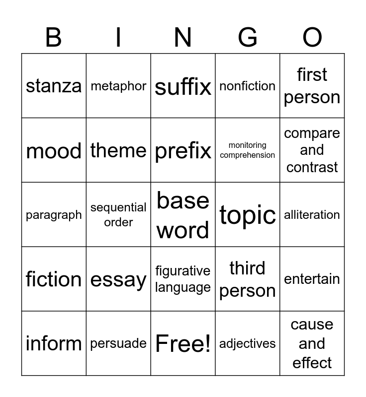 This bingo card has 31 words: Free!, resolution, sequential order, simile, stanza, suffix, theme, third person, topic, adjectives, alliteration, base word, cause and effect, central idea, compare and contrast, descriptive language, entertain, essay, fiction, figurative language, first person, imagery, inform, metaphor, monitoring comprehension, mood, nonfiction, paragraph, persuade, prefix and conflict.