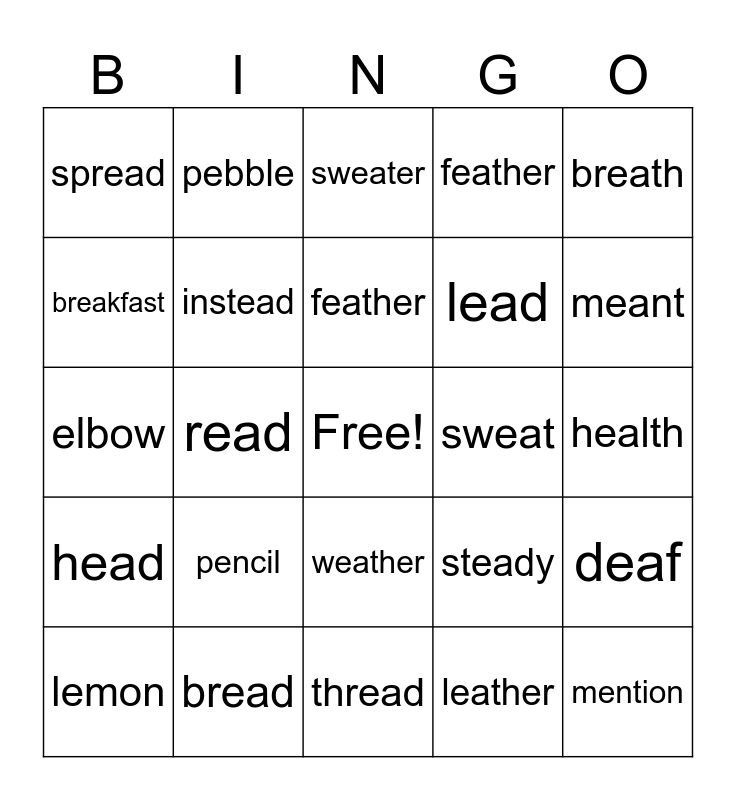 This bingo card has a free space and 24 words: pencil, bread, feather, lemon, breath, spread, breakfast, pebble, sweat, weather, lead, elbow, steady, deaf, instead, leather, health, sweater, meant, read, mention, head, feather and thread.