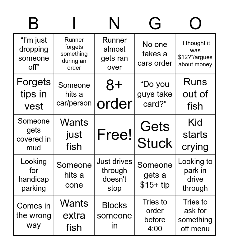 This bingo card has a free space and 24 words: Someone hits a cone, Wants extra fish, 8+ order, Comes in the wrong way, “I thought it was $12?”/argues about money, “I’m just dropping someone off”, Forgets tips in vest, Runner forgets something during an order, Gets Stuck, Just drives through doesn't stop, “Do you guys take card?”, Someone gets covered in mud, Someone gets a $15+ tip, Looking to park in drive through, Someone hits a car/person, Tries to order before 4:00, Kid starts crying, Runner almost gets ran over, Runs out of fish, Wants just fish, Tries to ask for something off menu, Looking for handicap parking, No one takes a cars order and Blocks someone in.