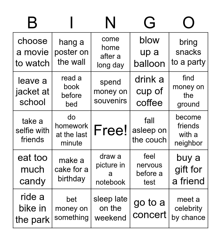 This bingo card has a free space and 70 words: be late for school, become friends with a neighbor, begin a new hobby, bend a paperclip, bet money on something, bite into a sandwich, blow up a balloon, break a phone screen, bring snacks to a party, build a Lego set, buy a gift for a friend, catch a cold in the winter, choose a movie to watch, come home after a long day, cut a piece of paper, do homework at the last minute, draw a picture in a notebook, drink a cup of coffee, drive to the supermarket, eat too much candy, fall asleep on the couch, feel nervous before a test, find money on the ground, fly on an airplane, forget a password, freeze water to make ice cubes, get lost in a new city, give a present to a friend, go to a concert, grow a plant in a pot, hang a poster on the wall, have a birthday party, hear a favorite song on the radio, hide a secret note, hit a baseball with a bat, hold a baby for the first time, hurt a finger while cooking, keep a diary, know the answer to a riddle, leave a jacket at school, lose a phone charger, make a cake for a birthday, meet a celebrity by chance, pay for lunch with cash, put a book on a shelf, read a book before bed, ride a bike in the park, run in a race, say hello to a stranger, see a rainbow after the rain, sell old clothes at a garage sale, send a text message, sing along to a favorite song, sit on a park bench, sleep late on the weekend, speak in front of a class, spend money on souvenirs, stand in line at a theme park, steal a cookie before dinner, swim in a pool, take a selfie with friends, teach someone how to tie their shoes, tell a funny joke, think about the future, throw a ball to a dog, understand a difficult math problem, wake up early for school, wear a costume on Halloween, win a prize at a carnival and write a letter to a pen pal.