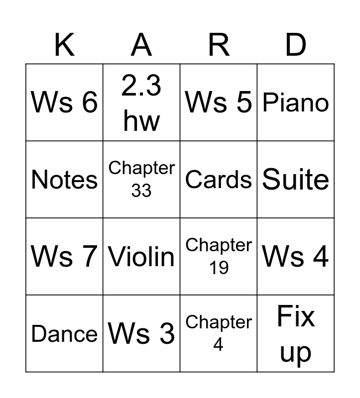 This bingo card has 16 words: Ws 3, Ws 4, Ws 5, Ws 6, Ws 7, 2.3 hw, Chapter 19, Chapter 4, Notes, Chapter 33, Dance, Piano, Violin, Suite, Cards and Fix up.