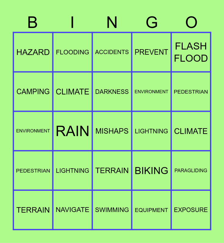 This bingo card has 35 words: MISHAPS, CONFUSION, THUNDER, ENVIRONMENT, EXPOSURE, HAZARD, CLIMATE, NAVIGATE, LIGHTNING, CLIMATE, ENVIRONMENT, FLOODING, TERRAIN, PEDESTRIAN, FLASH FLOOD, PEDESTRIAN, NAVIGATE, ACCIDENTS, EQUIPMENT, CLIMATE, TERRAIN, RAIN, MISHAPS, CLIMATE, PEDESTRIAN, CAMPING, HIKING, SWIMMING, BIKING, PARAGLIDING, RAIN, LIGHTNING, DARKNESS, PREVENT and SAFETY.