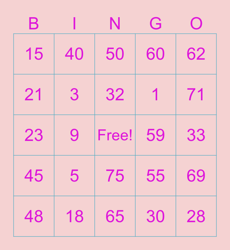 This bingo card has a free space and 24 words: 5, 18, 32, 48, 62, 15, 21, 40, 59, 75, 1, 23, 55, 69, 3, 30, 33, 50, 71, 9, 28, 45, 60 and 65.