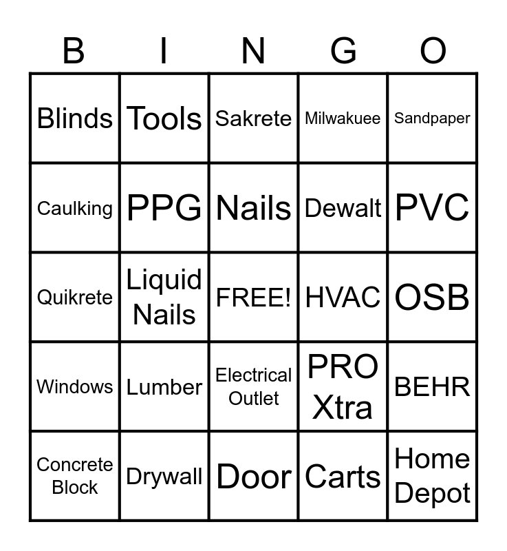 This bingo card has a free space and 24 words: Lumber, Drywall, Nails, Concrete Block, Sandpaper, Blinds, Caulking, Tools, HVAC, Electrical Outlet, Dewalt, Quikrete, PRO Xtra, BEHR, PPG, Carts, OSB, Sakrete, PVC, Liquid Nails, Home Depot, Windows, Milwakuee and Door.