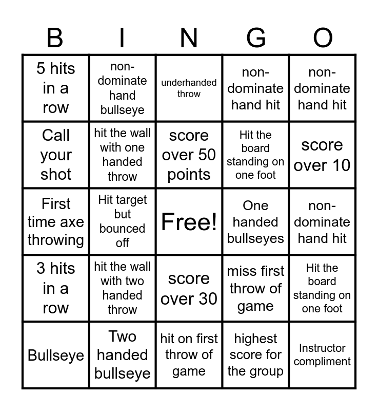 This bingo card has a free space and 29 words: Bullseye, Completely missed Target, Hit target but bounced off, 3 hits in a row, 5 hits in a row, underhanded throw, hit the wall with one handed throw, hit the wall with two handed throw, One handed bullseyes, Two handed bullseye, non-dominate hand hit, Instructor compliment, hit on first throw of game, highest score for the group, score over 10, score over 20, score over 30, 3 hits in a row, non-dominate hand hit, First time axe throwing, miss first throw of game, non-dominate hand bullseye, Hit the board standing on one foot, Call your shot, non-dominate hand hit, non-dominate hand bullseye, Hit the board standing on one foot, score over 50 points and hit the picture.