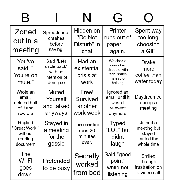 This bingo card has a free space and 29 words: Thought about quitting, but didn't, Pretended to be busy, Hidden on "Do Not Disturb" in chat, Sent "per my last email" with attitude, Spent way too long choosing a GIF, Zoned out in a meeting, Said "Lets circle back" with no intention of doing so, Had an existential crisis at work, Ignored an email until it wasn't relevent anymore, Joined a meeting but stayed muted the whole time, The WI-FI goes down., Muted Yourself and talked anyways, Said "good point" while not listening, Smiled through frustration on a video call, Wrote an email, deleted half of it and rewrote, Laughed at a joke that wasn't funny, Secretly worked from bed, Typed "LOL" but didnt laugh, Drake more coffee than water today, Replied "Great Work!" without reading document, Stayed in a meeting for the gossip, Took a break that lasted a little too long, Watched a coworker struggle with tech issues instead of helping, Daydreamed during a meeting, You've said, " You're on mute.", Spreadsheet crashes before saving., The meeting runs 20 minutes over., Printer runs out of paper..... again. and "Can you see my screen?".