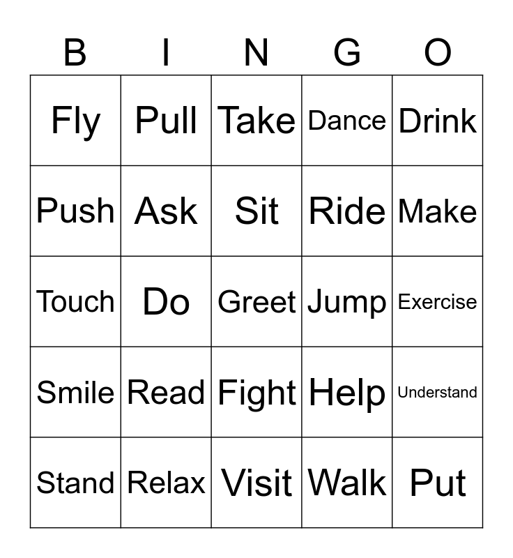 This bingo card has a free space and 24 words: Read, Relax, Sit, Stand, Drink, Fly, Push, Pull, Jump, Fight, Ride, Touch, Help, Understand, Ask, Walk, Exercise, Take, Make, Do, Put, Smile, Dance and Visit.