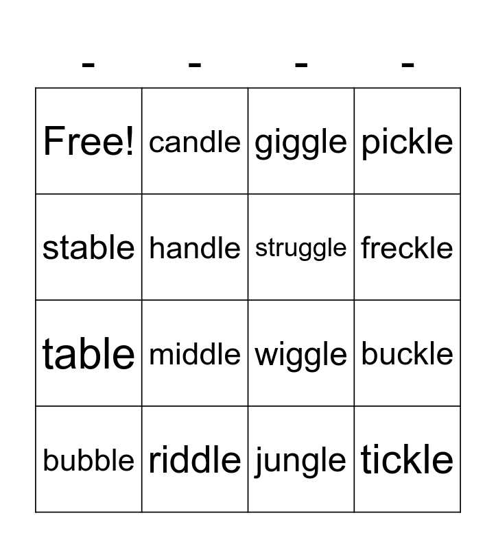 This bingo card has 16 words: bubble, riddle, giggle, pickle, stable, candle, wiggle, buckle, Free!, handle, jungle, freckle, table, middle, struggle and tickle.