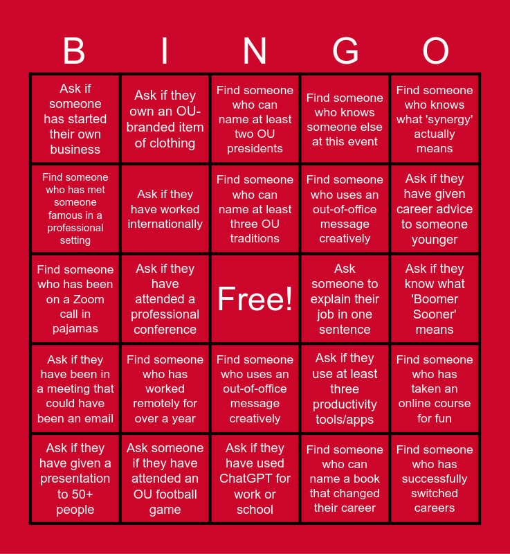 This bingo card has a free space and 24 words: Find someone who has worked remotely for over a year, Ask someone if they have attended an OU football game, Find someone who can name at least three OU traditions, Ask if they have given a presentation to 50+ people, Find someone who knows what 'synergy' actually means, Ask if someone has started their own business, Find someone who has met someone famous in a professional setting, Ask if they own an OU-branded item of clothing, Ask someone to explain their job in one sentence, Find someone who uses an out-of-office message creatively, Find someone who uses an out-of-office message creatively, Find someone who has been on a Zoom call in pajamas, Ask if they use at least three productivity tools/apps, Find someone who has taken an online course for fun, Ask if they have worked internationally, Find someone who can name a book that changed their career, Ask if they know what 'Boomer Sooner' means, Find someone who can name at least two OU presidents, Ask if they have given career advice to someone younger, Ask if they have attended a professional conference, Find someone who has successfully switched careers, Ask if they have been in a meeting that could have been an email, Find someone who knows someone else at this event and Ask if they have used ChatGPT for work or school.
