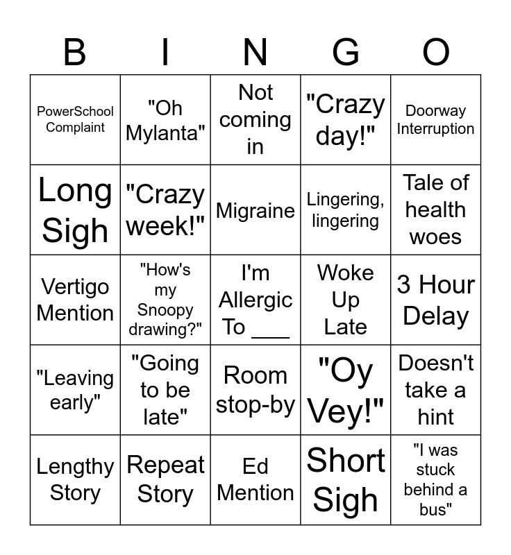 This bingo card has a free space and 24 words: Lengthy Story, "Going to be late", Migraine, Short Sigh, Doorway Interruption, PowerSchool Complaint, "Oh Mylanta", Not coming in, Woke Up Late, 3 Hour Delay, Vertigo Mention, "Crazy week!", "Oy Vey!", Doesn't take a hint, Long Sigh, Repeat Story, Ed Mention, "Crazy day!", Tale of health woes, "Leaving early", "How's my Snoopy drawing?", Room stop-by, Lingering, lingering and "I was stuck behind a bus".