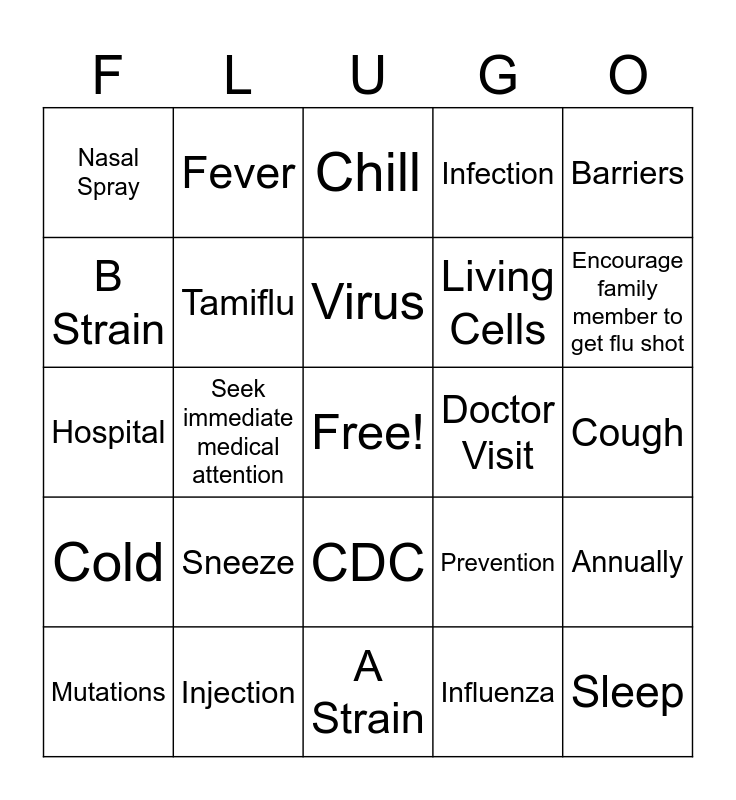This bingo card has a free space and 24 words: Sneeze, Injection, Virus, Mutations, Barriers, Nasal Spray, B Strain, Fever, Doctor Visit, CDC, Living Cells, Hospital, Prevention, Annually, Tamiflu, Influenza, Cough, Chill, Encourage family member to get flu shot, Seek immediate medical attention, Sleep, Cold, Infection and A Strain.