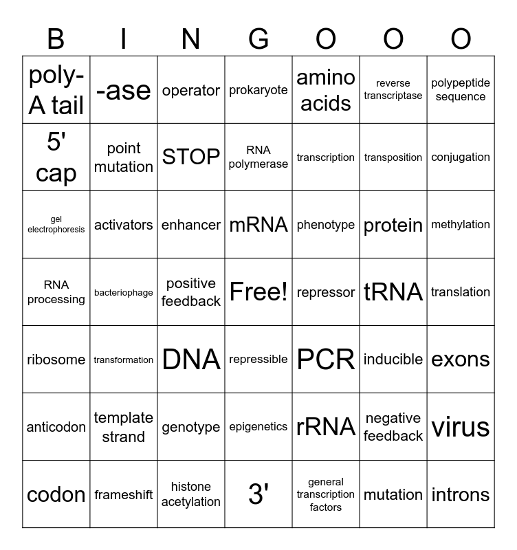 This bingo card has a free space and 48 words: rRNA, transposition, 3', bacteriophage, enhancer, translation, -ase, frameshift, reverse transcriptase, repressible, polypeptide sequence, prokaryote, protein, phenotype, anticodon, tRNA, 5' cap, conjugation, negative feedback, amino acids, transcription, positive feedback, poly-A tail, point mutation, virus, STOP, methylation, codon, mRNA, activators, mutation, repressor, exons, template strand, RNA processing, PCR, inducible, gel electrophoresis, DNA, genotype, ribosome, introns, operator, histone acetylation, RNA polymerase, epigenetics, transformation and general transcription factors.