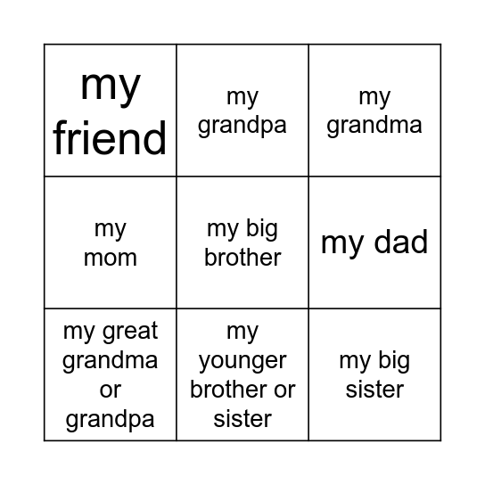 This bingo card has 9 words: my great grandma or grandpa, my grandma, my grandpa, my mom, my friend, my dad, my big brother, my big sister and my younger brother or sister.