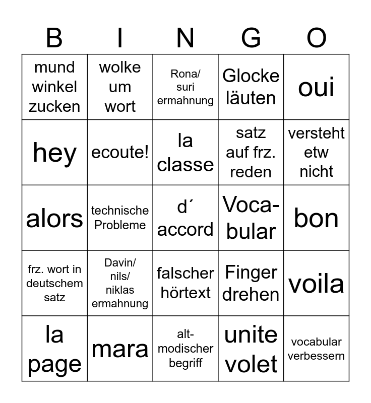 This bingo card has a free space and 24 words: Davin/ nils/ niklas ermahnung, mara, la classe, la page, oui, mund winkel zucken, hey, wolke um wort, Voca- bular, falscher hörtext, satz auf frz. reden, alors, Finger drehen, voila, ecoute!, unite volet, bon, Rona/ suri ermahnung, versteht etw nicht, technische Probleme, vocabular verbessern, frz. wort in deutschem satz, Glocke läuten and alt- modischer begriff.
