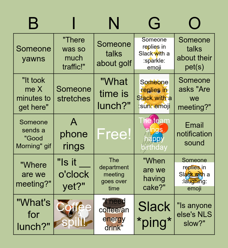 This bingo card has 6 images, a free space and 31 words: "I need coffee/an energy drink", Someone says "Happy Birthday!", A phone rings, Someone makes a dad joke, Someone yawns, Someone talks about golf, Someone stretches, "When are we having cake?", The team sings happy birthday, Slack *ping*, Email notification sound, "Is anyone else's NLS slow?", In Zoom, "Can you hear me?", "I need to restart", Someone asks "Are we meeting?", "What procedure is ____ in?", Someone replies in Slack with a :laughing: emoji, "Is it __ o'clock yet?", "Where are we meeting?", The department meeting goes over time, Someone talks about their pet(s), Someone gets up and forgets to lock their screen, "What's for lunch?", "There was so much traffic!", Someone replies in Slack with a :sun: emoji, "It took me X minutes to get here", Someone replies in Slack with a :sparkle: emoji, Someone sends a "Good Morning" gif, Coffee spill!, "What time is lunch?" and "I'm hungry/ starving".