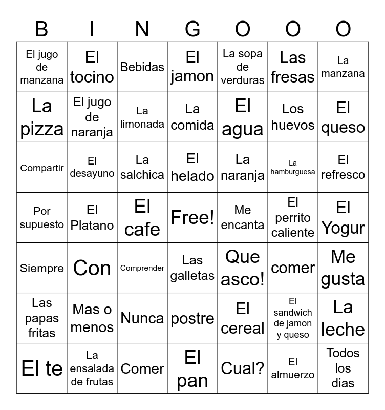 This bingo card has a free space and 48 words: El cereal, Los huevos, El pan, El Platano, La salchica, El Yogur, El tocino, La ensalada de frutas, Las fresas, Las galletas, La manzana, El jamon, La hamburguesa, La naranja, Las papas fritas, El perrito caliente, La pizza, El queso, El sandwich de jamon y queso, La sopa de verduras, El agua, El cafe, El jugo de manzana, El jugo de naranja, La leche, La limonada, El refresco, El te, El helado, El desayuno, El almuerzo, Me encanta, Me gusta, Mas o menos, Por supuesto, Que asco!, comer, Compartir, Comprender, Nunca, Siempre, Todos los dias, Bebidas, Comer, La comida, postre, Con and Cual?.