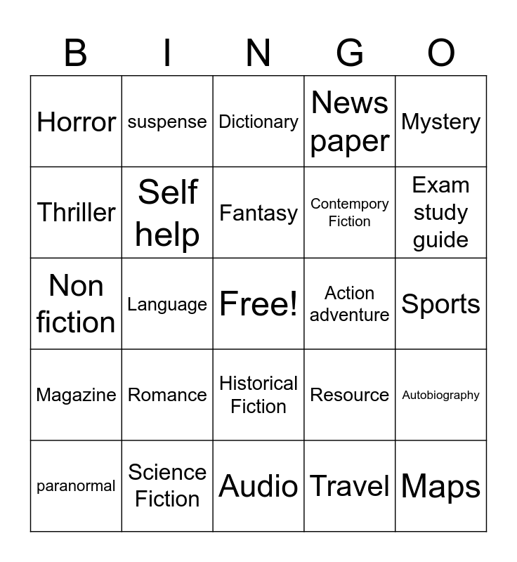 This bingo card has a free space and 24 words: Romance, Science Fiction, Fantasy, paranormal, Mystery, Horror, Thriller, suspense, Action adventure, Historical Fiction, Contempory Fiction, Non fiction, Resource, Autobiography, Self help, Travel, Sports, Dictionary, Exam study guide, Language, Maps, Magazine, News paper and Audio.