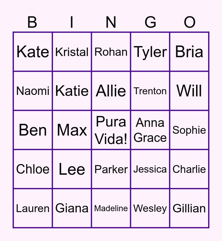 This bingo card has a free space and 24 words: Lee, Giana, Allie, Lauren, Bria, Kate, Naomi, Kristal, Anna Grace, Parker, Trenton, Ben, Jessica, Charlie, Katie, Wesley, Sophie, Rohan, Will, Max, Gillian, Chloe, Tyler and Madeline.