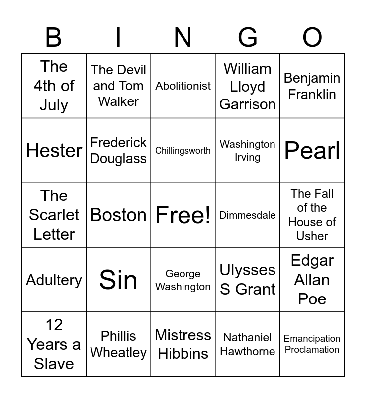 This bingo card has a free space and 24 words: Sin, Phillis Wheatley, Chillingsworth, 12 Years a Slave, Benjamin Franklin, The 4th of July, Hester, The Devil and Tom Walker, Dimmesdale, George Washington, Washington Irving, The Scarlet Letter, Ulysses S Grant, Edgar Allan Poe, Frederick Douglass, Nathaniel Hawthorne, The Fall of the House of Usher, Abolitionist, Pearl, Boston, Emancipation Proclamation, Adultery, William Lloyd Garrison and Mistress Hibbins.
