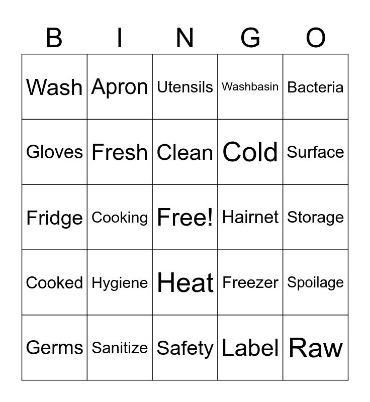 This bingo card has a free space and 24 words: Hygiene, Sanitize, Clean, Germs, Bacteria, Wash, Gloves, Apron, Hairnet, Heat, Cold, Fridge, Freezer, Spoilage, Fresh, Label, Storage, Utensils, Surface, Cooking, Raw, Cooked, Washbasin and Safety.