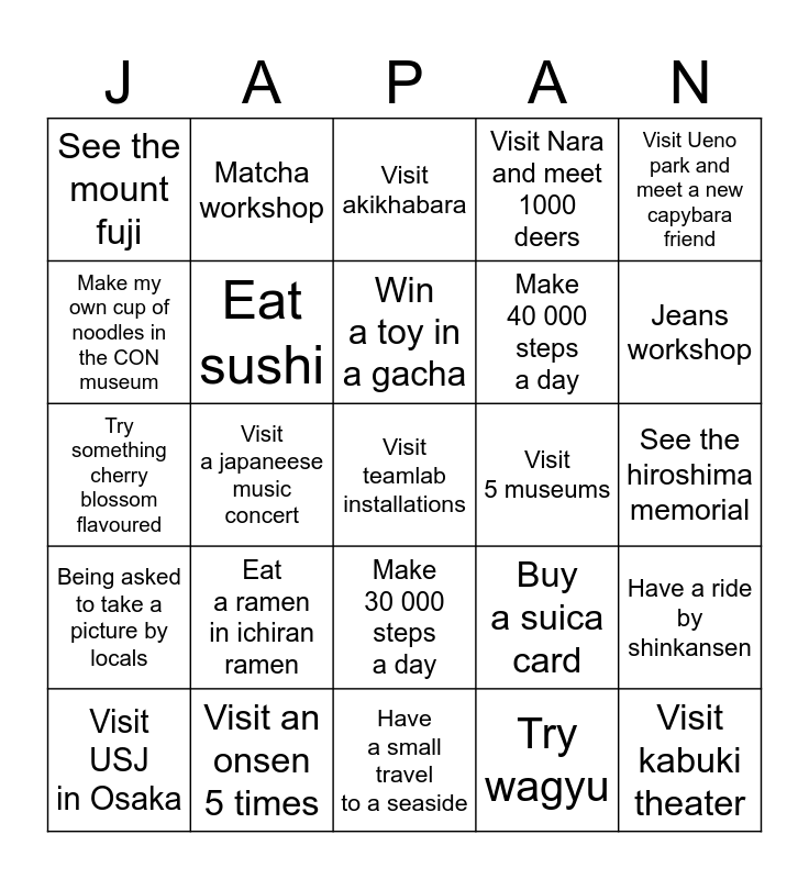This bingo card has a free space and 24 words: Eat a ramen in ichiran ramen, Visit an onsen 5 times, Win a toy in a gacha, Visit USJ in Osaka, Visit Ueno park and meet a new capybara friend, See the mount fuji, Make my own cup of noodles in the CON museum, Matcha workshop, Visit 5 museums, Make 30 000 steps a day, Make 40 000 steps a day, Try something cherry blossom flavoured, Buy a suica card, Have a ride by shinkansen, Eat sushi, Try wagyu, See the hiroshima memorial, Visit akikhabara, Jeans workshop, Visit a japaneese music concert, Visit kabuki theater, Being asked to take a picture by locals, Visit Nara and meet 1000 deers and Have a small travel to a seaside.