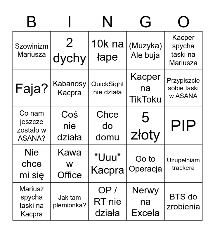 This bingo card has a free space and 24 words: Kawa w Office, Jak tam plemionka?, QuickSight nie działa, Mariusz spycha taski na Kacpra, Kacper spycha taski na Mariusza, Szowinizm Mariusza, Faja?, 2 dychy, 5 złoty, "Uuu" Kacpra, Kacper na TikToku, Co nam jeszcze zostało w ASANA?, Go to Operacja, Uzupełniam trackera, Kabanosy Kacpra, Nerwy na Excela, PIP, 10k na łape, Przypiszcie sobie taski w ASANA, Coś nie działa, BTS do zrobienia, Nie chce mi się, (Muzyka) Ale buja and OP / RT nie działa.