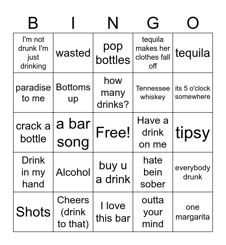 This bingo card has a free space and 29 words: Shots, red red wine, a bar song, two pina coladas, I'm not drunk I'm just drinking, pop bottles, Bottoms up, Alcohol, Have a drink on me, Cheers (drink to that), tipsy, one margarita, I love this bar, outta your mind, its 5 o'clock somewhere, Takin shots, buy u a drink, Drink in my hand, tequila, crack a bottle, hate bein sober, hole in the bottle, Tennessee whiskey, paradise to me, tequila makes her clothes fall off, wasted, everybody drunk, how many drinks? and alcoholic.