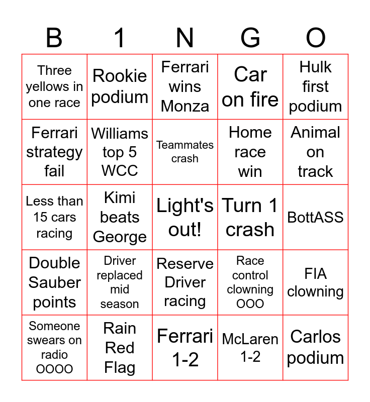 This bingo card has a free space and 24 words: Driver replaced mid season, Rain Red Flag, Teammates crash, Someone swears on radio OOOO, Hulk first podium, Three yellows in one race, Ferrari strategy fail, Rookie podium, Turn 1 crash, Reserve Driver racing, Home race win, Less than 15 cars racing, Race control clowning OOO, FIA clowning, Williams top 5 WCC, McLaren 1-2, BottASS, Ferrari wins Monza, Animal on track, Kimi beats George, Carlos podium, Double Sauber points, Car on fire and Ferrari 1-2.