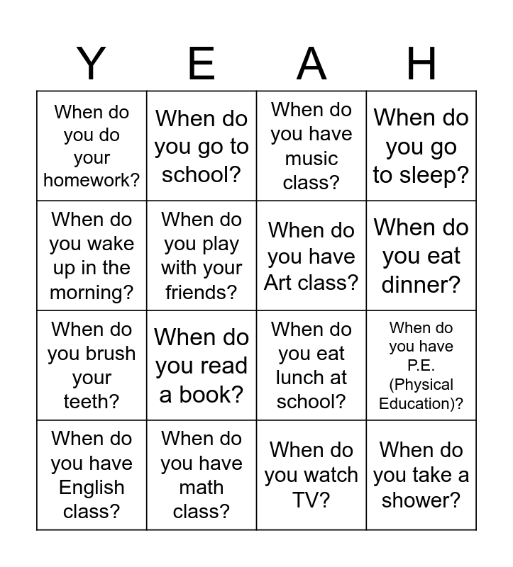 This bingo card has 16 words: When do you have English class?, When do you have math class?, When do you have music class?, When do you go to sleep?, When do you wake up in the morning?, When do you go to school?, When do you eat lunch at school?, When do you have P.E. (Physical Education)?, When do you do your homework?, When do you play with your friends?, When do you watch TV?, When do you eat dinner?, When do you brush your teeth?, When do you read a book?, When do you have Art class? and When do you take a shower?.