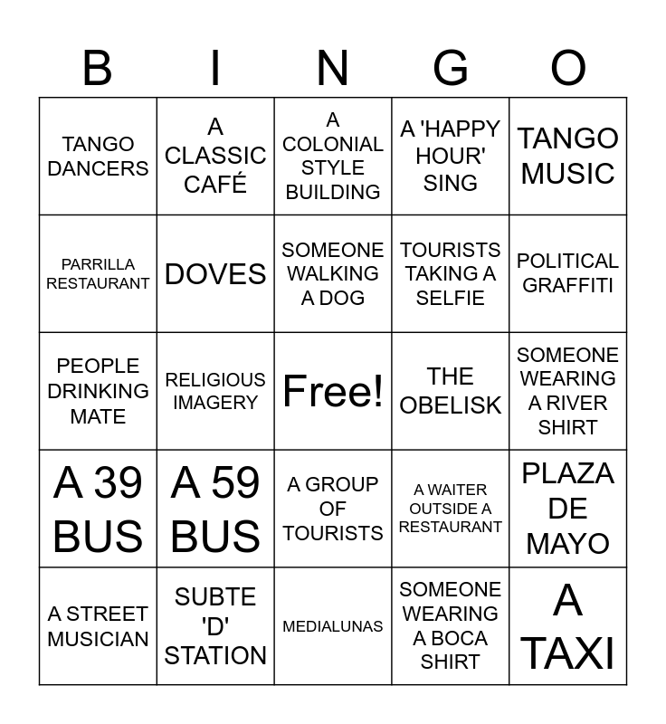 This bingo card has a free space and 24 words: A 59 BUS, SUBTE 'D' STATION, SOMEONE WALKING A DOG, A STREET MUSICIAN, TANGO MUSIC, TANGO DANCERS, PARRILLA RESTAURANT, A CLASSIC CAFÉ, THE OBELISK, A GROUP OF TOURISTS, TOURISTS TAKING A SELFIE, PEOPLE DRINKING MATE, A WAITER OUTSIDE A RESTAURANT, PLAZA DE MAYO, DOVES, SOMEONE WEARING A BOCA SHIRT, SOMEONE WEARING A RIVER SHIRT, A COLONIAL STYLE BUILDING, POLITICAL GRAFFITI, RELIGIOUS IMAGERY, A TAXI, A 39 BUS, A 'HAPPY HOUR' SING and MEDIALUNAS.