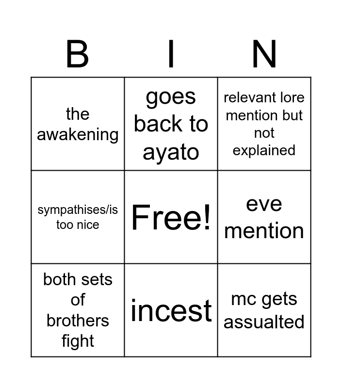 This bingo card has a free space and 8 words: eve mention, relevant lore mention but not explained, goes back to ayato, both sets of brothers fight, the awakening, mc gets assualted, sympathises/is too nice and incest.