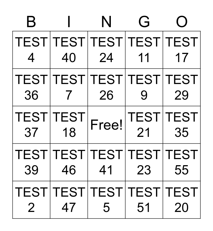 This bingo card has a free space and 56 words: TEST 1, TEST 2, TEST 3, TEST 4, TEST 5, TEST 6, TEST 7, TEST 8, TEST 9, TEST 10, TEST 11, TEST 12, TEST 13, TEST 14, TEST 15, TEST 16, TEST 17, TEST 18, TEST 19, TEST 20, TEST 21, TEST 22, TEST 23, TEST 24, TEST 25, TEST 26, TEST 27, TEST 28, TEST 29, TEST 30, TEST 31, TEST 32, TEST 33, TEST 34, TEST 35, TEST 36, TEST 37, TEST 38, TEST 39, TEST 40, TEST 41, TEST 42, TEST 43, TEST 44, TEST 45, TEST 46, TEST 47, TEST 48, TEST 49, TEST 50, TEST 51, TEST 52, TEST 53, TEST 54, TEST 55 and TEST 56.