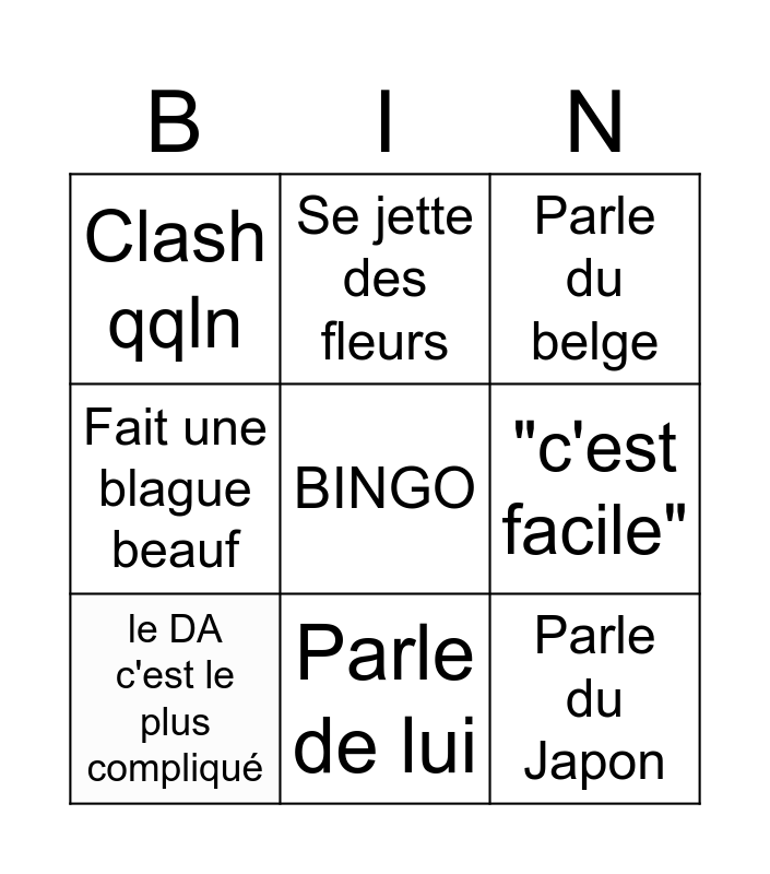 This bingo card has a free space and 10 words: Parle de lui, Parle du belge, Clash qqln, Parle du Japon, Fait une blague beauf, le DA c'est le plus compliqué, Se jette des fleurs, Parle politique, "c'est facile" and ma matière c'est la plus compliquée.