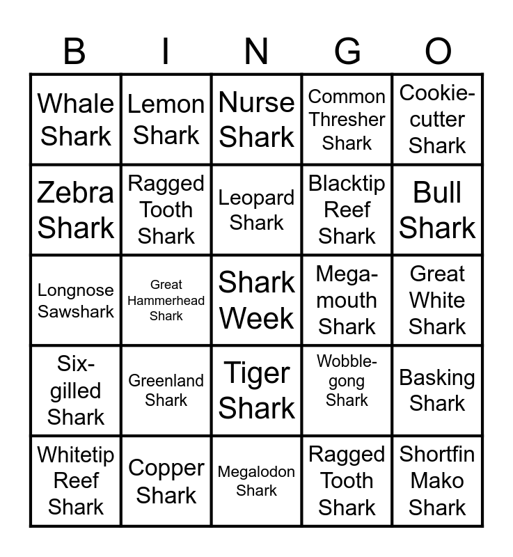 This bingo card has a free space and 24 words: Greenland Shark, Copper Shark, Leopard Shark, Whitetip Reef Shark, Cookie-cutter Shark, Whale Shark, Zebra Shark, Lemon Shark, Mega-mouth Shark, Tiger Shark, Blacktip Reef Shark, Longnose Sawshark, Wobble-gong Shark, Basking Shark, Ragged Tooth Shark, Ragged Tooth Shark, Great White Shark, Nurse Shark, Bull Shark, Great Hammerhead Shark, Shortfin Mako Shark, Six-gilled Shark, Common Thresher Shark and Megalodon Shark.