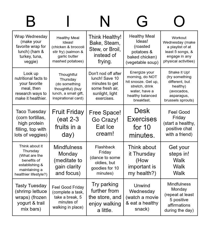 This bingo card has a free space and 24 words: Mindfulness Monday (meditate to gain clarity and focus), Feel Good Friday (complete a task, take a break, 5 minutes of walking in place), Don't nod off after lunch! Save 10 minutes to get some fresh air, sunlight, light exercises., Tasty Tuesday (shrimp lettuce wraps) (frozen yogurt & trail mix bars), Workout Wednesday (make a playlist of at least 5 songs, & engage in any physical activities), Wrap Wednesday (make your favorite wrap for lunch) (ham & turkey, tuna, veggie), Look up nutritional facts to your favorite meal, then research ways to make it healthier., Healthy Meal Ideas! (chicken & broccoli stir fry) (salmon & garlic butter mashed potatoes), Desk Exercises for 10 minutes., Flashback Friday (dance to some oldies, but goodies for 10 minutes), Energize your morning, do NOT hit snooze. Get up, stretch, drink water, have a healthy balanced breakfast., Taco Tuesday (corn tortillas, high protein filling, top with lots of veggies), Think about it Thursday (How important is my health?), Get your steps in! Walk Walk Walk, Thoughtful Thursday (do something thoughtful) (buy lunch, a small gift, inspirational card), Unwind Wednesday (watch a movie & eat a healthy snack), Feel Good Friday (start a healthy, positive chat with a friend), Think Healthy! Bake, Steam, Stew, or Broil, instead of frying., Shake it Up! (try something different, but healthy) (avocados, asparagus, brussels sprouts), Fruit Friday (eat 2-3 fruits in a day), Mindfulness Monday (repeat at least 5 positive affirmations during the day), Think about it Thursday (What are the benefits of establishing & maintaining a healthier lifestyle?), Healthy Meal Ideas! (roasted potatoes & baked chicken) (vegetable soup) and Try parking further from the store, and enjoy walking a little..