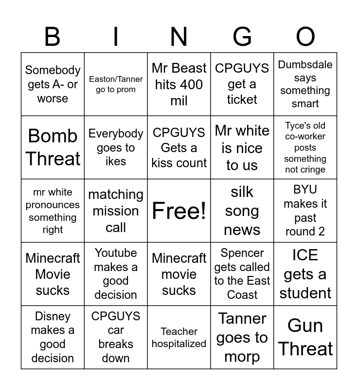 This bingo card has a free space and 33 words: Student Suicide, Student Seizure, CPGUYS Gets a kiss count, Tanner gets Computer usage, BYU makes it past round 2, Somebody gets A- or worse, Everybody goes to ikes, Teacher hospitalized, Mr white is nice to us, Gun Threat, Bomb Threat, Easton/Tanner go to prom, Tanner goes to morp, The pope, biden, or trump die, mr white pronounces something right, matching mission call, Minecraft movie sucks, Spencer gets called to the East Coast, ICE gets a student, Minecraft Movie sucks, CPGUYS car breaks down, Witness a car accident, CPGUYS get a ticket, Tyce's old co-worker posts something not cringe, Snow White movie sucks, Youtube makes a good decision, Mr Beast hits 400 mil, silk song news, Dumbsdale says something smart, Disney makes a good decision, Ubisoft makes a good decision, Mr white uses a brainrot term and Nintendo Switch 2 has little game selection.