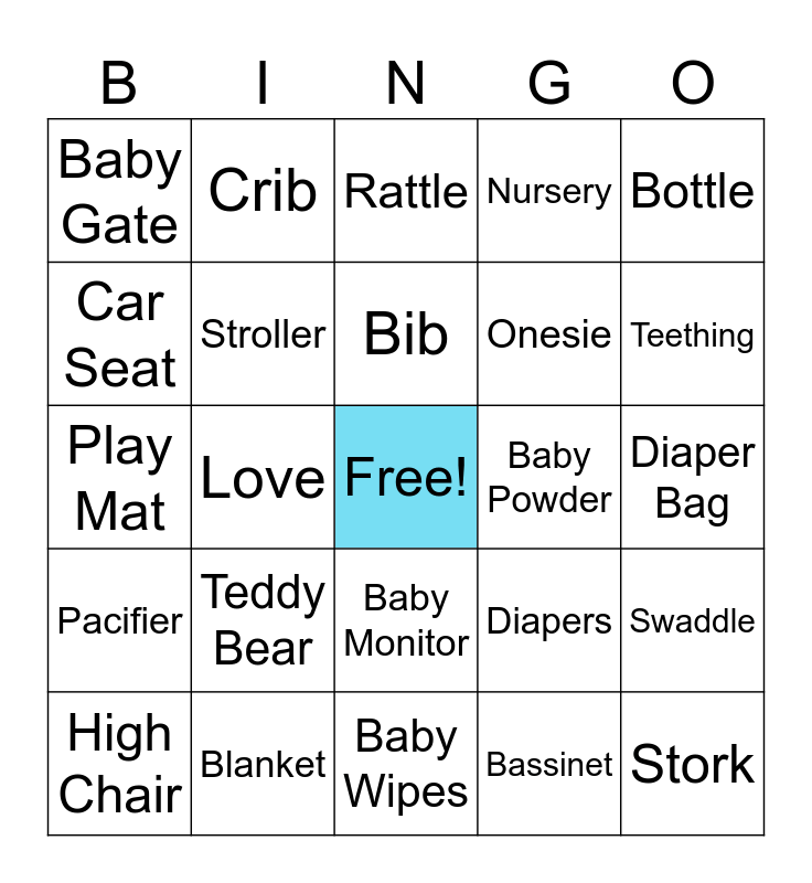 This bingo card has a free space and 26 words: Baby Monitor, Bassinet, Bib, Blanket, Bottle, Baby Gate, Car Seat, Crib, Diaper Bag, Diapers, Onesie, Play Mat, Swaddle, High Chair, Love, Nap Time, Nursery, Pacifier, Rattle, Stork, Teething, Baby Wipes, Baby Powder, Teddy Bear, Stroller and Lullaby.