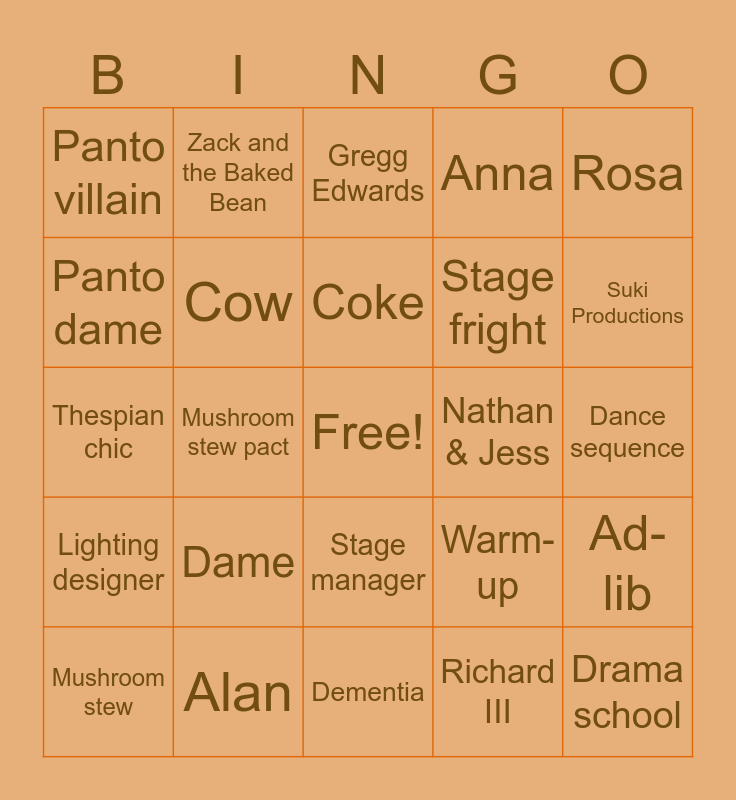 This bingo card has a free space and 44 words: Pantomime, Drama school, Back end of a cow, Mushroom stew, Dianne Arlington OBE, Richard III, Gregg Edwards, Josh, Rosa, Alan, Anna, Nathan & Jess, Stage manager, Dame, CPR, Dementia, Hot yoga, Thespian chic, NDA, Suki Productions, Zack and the Baked Bean, Joseph and the Amazing Technicolour Dreamcoat, Staying Alive, Panto villain, Cravatte, Dance sequence, Final bows, Break a leg, Warm-up, Lighting designer, Dressing room, Ad-lib, Overdose, Fairy Godmother, Mushroom stew pact, Drama degree, RADA, National Theatre, Coke, Panto dame, Stage fright, Drama school, Cow and Beanstalk.