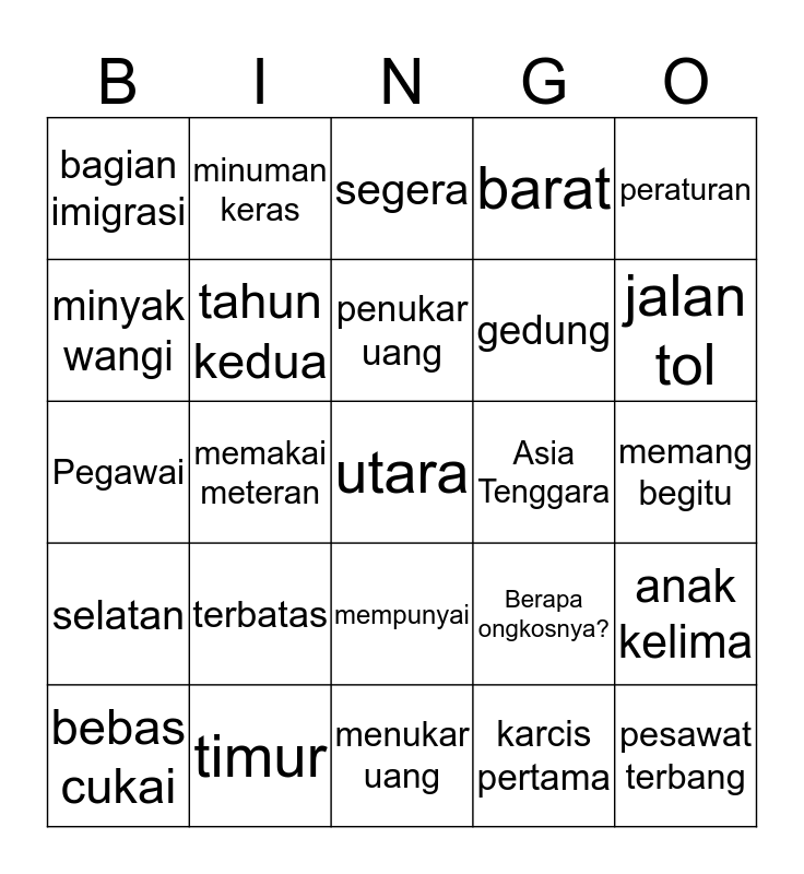 This bingo card has 25 words: terbatas, menukar uang, penukar uang, bebas cukai, peraturan, bagian imigrasi, minyak wangi, minuman keras, Asia Tenggara, mempunyai, gedung, Pegawai, Berapa ongkosnya?, anak kelima, tahun kedua, pesawat terbang, memang begitu, segera, jalan tol, memakai meteran, utara, timur, selatan, barat and karcis pertama.