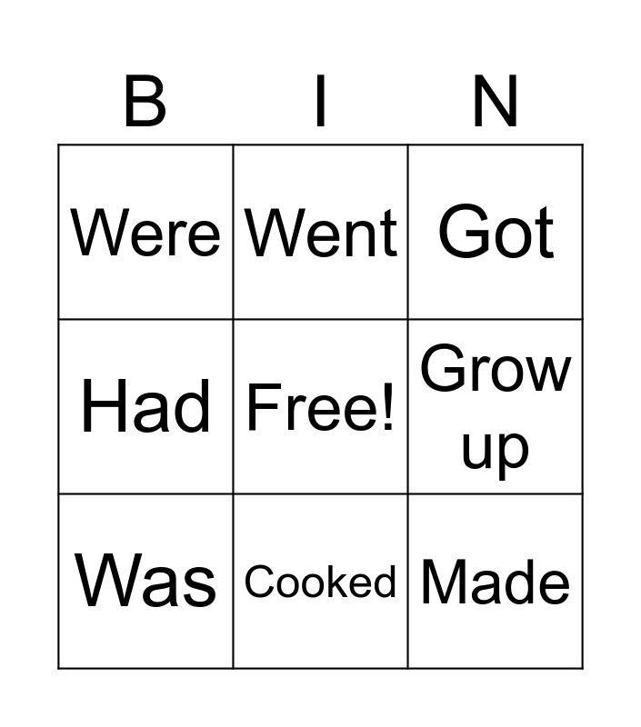 This bingo card has a free space and 15 words: Finished, Ate, Got, Were, Cooked, Made, Did, Walked, Grow up, Moved, Danced, Had, Was, Went and Live.
