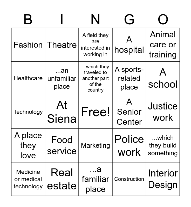 This bingo card has a free space and 24 words: Food service, Real estate, ...which they traveled to another part of the country, Medicine or medical technology, Animal care or training, Fashion, Healthcare, Theatre, A Senior Center, Marketing, A sports-related place, Technology, Police work, ...which they build something, ...an unfamiliar place, Construction, Justice work, A field they are interested in working in, A school, At Siena, Interior Design, A place they love, A hospital and ...a familiar place.