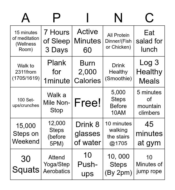 This bingo card has a free space and 24 words: 12,000 Steps (before 5PM), Attend Yoga/Step Aerobatics, Burn 2,000 Calories, 30 Squats, Eat salad for lunch, 15 minutes of meditation (Wellness Room), Walk to 2311from (1705/1619), 7 Hours of Sleep 3 Days, 5,000 Steps Before 10AM, Drink 8 glasses of water, Drink Healthy (Smoothie), 100 Set-ups/crunches, 10 minutes walking the stairs @1705, 45 minutes at gym, Plank for 1minute, 10, 000 Steps (By 2pm), 5 minutes of mountain climbers, Active Minutes 60, Log 3 Healthy Meals, Walk a Mile Non-Stop, 10 Minutes of jump rope, 15,000 Steps on Weekend, All Protein Dinner/(Fish or Chicken) and 10 Push-ups.