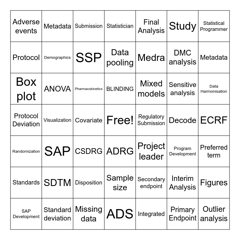 This bingo card has a free space and 59 words: SAP Development, SDTM, ADaM, ADS, Final Analysis, Interim Analysis, Statistical Programmer, Principal Programmer, Demographics, Disposition, Statistician, Project leader, Study, ECRF, Standards, Metadata, Submission, Data pooling, Integrated, DMC analysis, Metadata, Protocol, SAP, SSP, TLF, Program Development, Data Harmonisation, IAP, ANOVA, Covariate, SMT, Regulatory Submission, Efficacy, Safety analysis, Adverse events, Define.xml, CSDRG, BLINDING, Mixed models, Sensitive analysis, Figures, Box plot, Visualization, Power calculation, ADRG, Secondary endpoint, Primary Endpoint, Outlier analysis, Protocol Deviation, Standard deviation, Missing data, Sample size, Medra, Decode, Preferred term, Randomization, Pharmacovigilance, Pharmacokinetics and Biomarkers.
