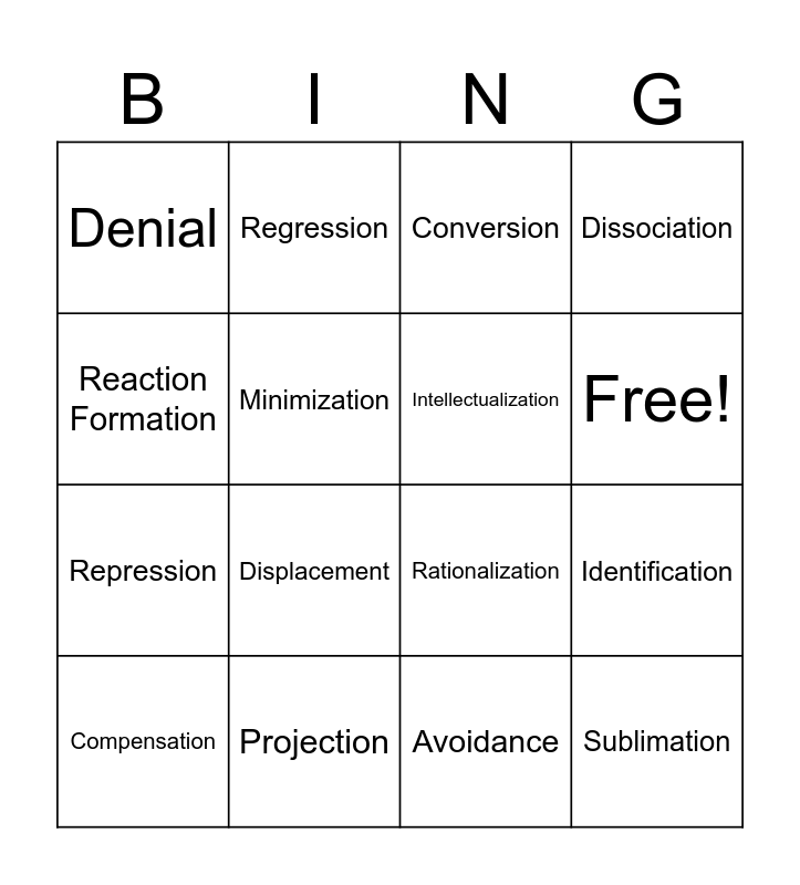 This bingo card has 17 words: Avoidance, Compensation, Conversion, Denial, Displacement, Dissociation, Identification, Intellectualization, Free!, Minimization, Projection, Rationalization, Reaction Formation, Regression, Repression, Restitution and Sublimation.
