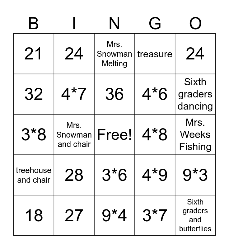 This bingo card has a free space and 24 words: 28, 27, 36, 18, 24, 21, 32, 24, 4*8, 3*6, 4*6, 3*8, 4*9, 9*3, 4*7, 3*7, Mrs. Weeks Fishing, Mrs. Snowman Melting, Sixth graders dancing, Mrs. Snowman and chair, Sixth graders and butterflies, treehouse and chair, treasure and 9*4.