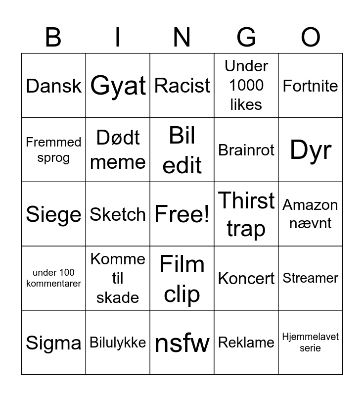 This bingo card has a free space and 24 words: Komme til skade, Bilulykke, Bil edit, Sigma, Fortnite, Dansk, Fremmed sprog, Gyat, Thirst trap, Film clip, Brainrot, Siege, Koncert, Streamer, Dødt meme, Reklame, Amazon nævnt, Racist, Dyr, Sketch, Hjemmelavet serie, under 100 kommentarer, Under 1000 likes and nsfw.