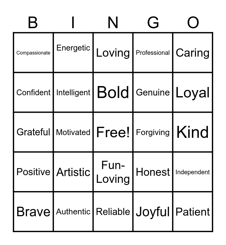 This bingo card has a free space and 24 words: Artistic, Authentic, Bold, Brave, Caring, Compassionate, Confident, Energetic, Forgiving, Fun-Loving, Genuine, Grateful, Honest, Independent, Intelligent, Joyful, Kind, Loving, Loyal, Motivated, Patient, Positive, Professional and Reliable.