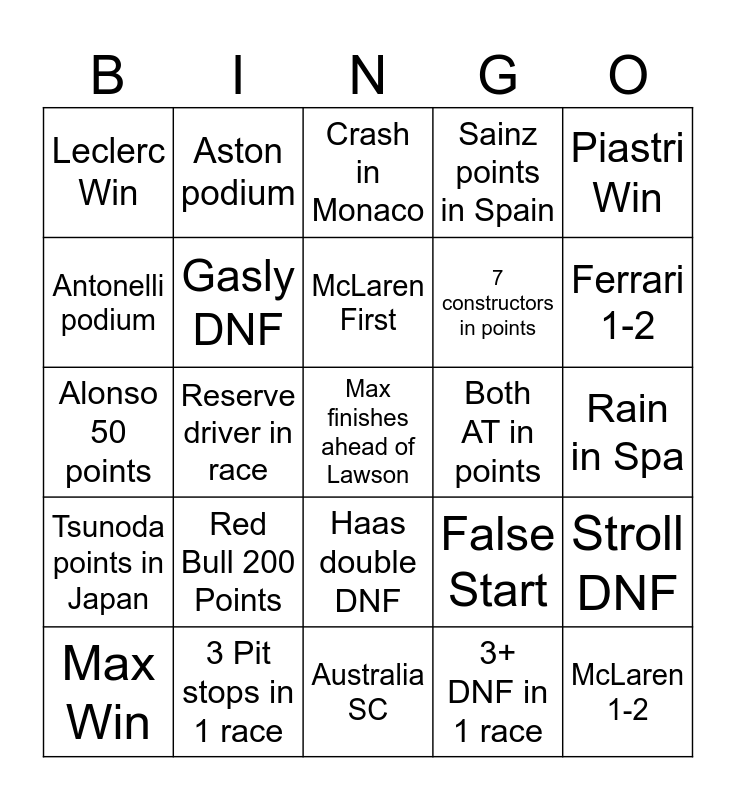 This bingo card has a free space and 24 words: Red Bull 200 Points, 3 Pit stops in 1 race, McLaren First, Max Win, Piastri Win, Leclerc Win, Antonelli podium, Aston podium, Both AT in points, Haas double DNF, 7 constructors in points, Alonso 50 points, False Start, Stroll DNF, Gasly DNF, 3+ DNF in 1 race, Rain in Spa, Crash in Monaco, Ferrari 1-2, Reserve driver in race, McLaren 1-2, Tsunoda points in Japan, Sainz points in Spain and Australia SC.